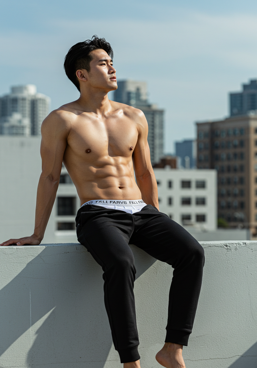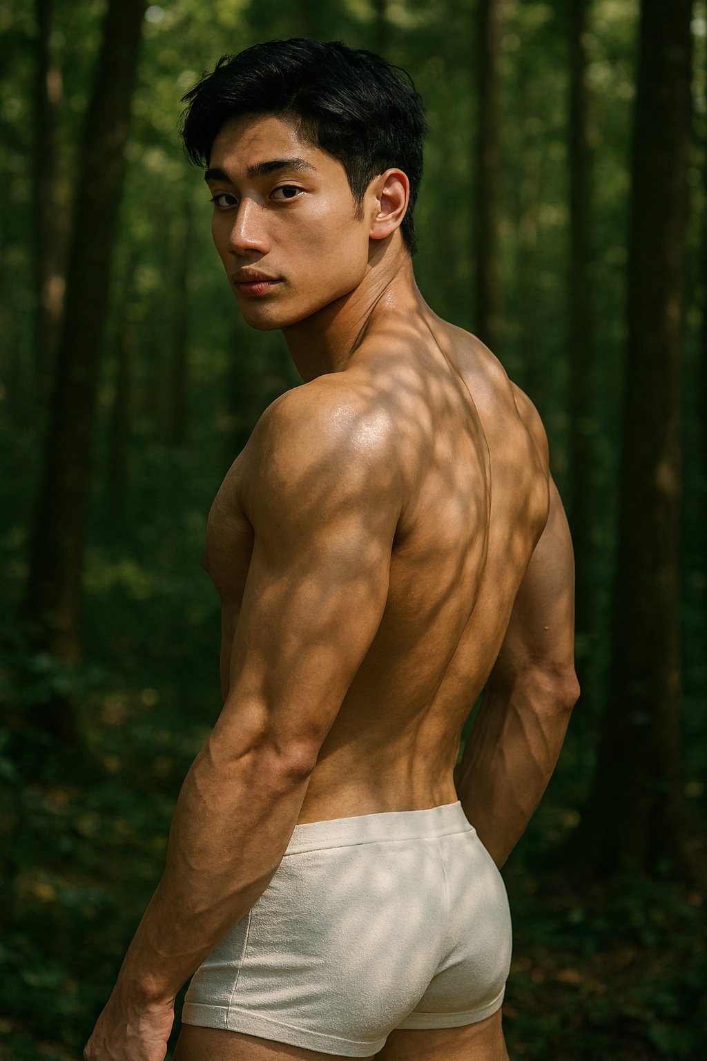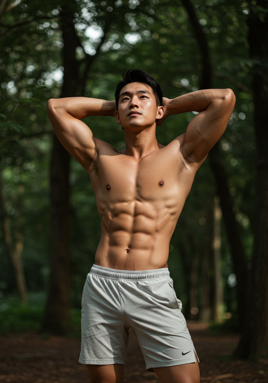 朝の光が差し込む、観葉植物のあるバスルーム。しっとりと濡れた髪、引き締まった胸筋と腹筋、そのすべてが静けさの中で際立つ。今回のモデルは、若きアジア系の美しい肉体を持つ男性。競パン姿で立つその姿は、日常の空間に彫刻のような存在感を与えてくれま...
